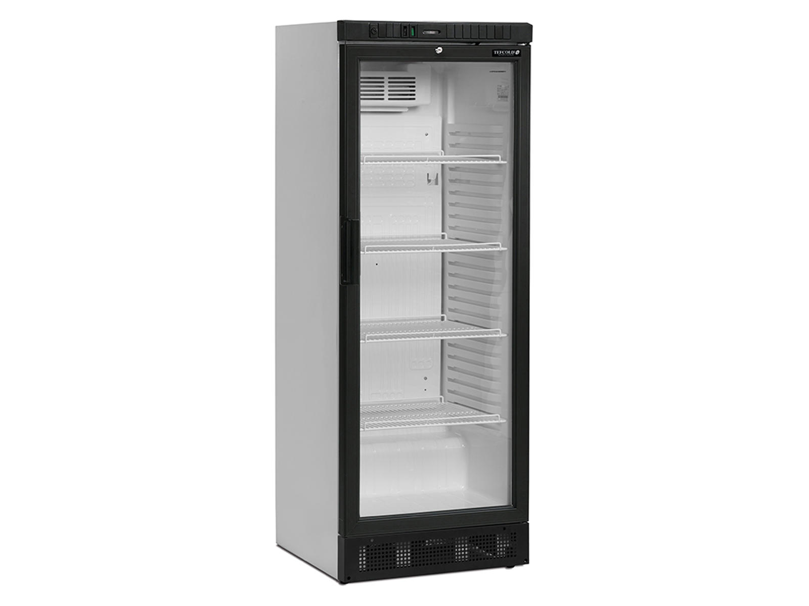 The Tefcold SCU1375CP is a professional display refrigerator with a capacity of 347 liters, designed to showcase your products effectively. With a hinged glass door, aluminum frame, and built-in LED lighting in the D-shaped light top, it ensures maximum visibility, while the even fan cooling keeps items fresh at temperatures between +2 and +10°C.