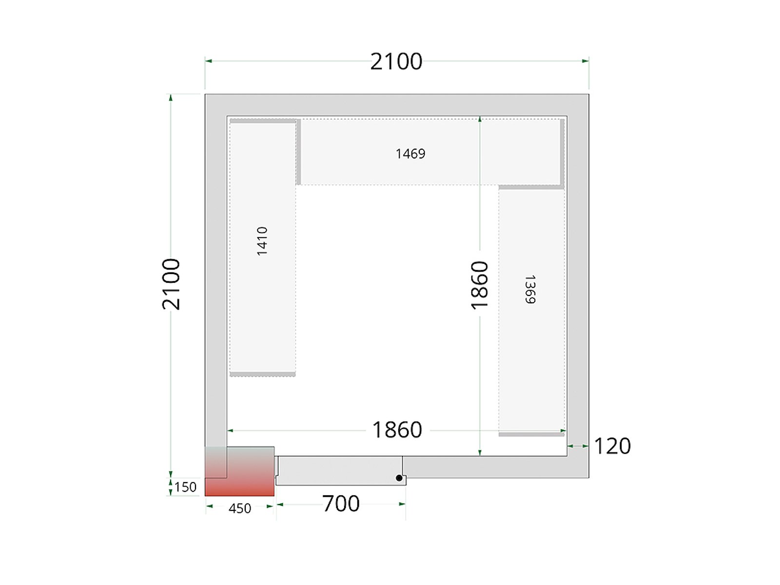 The freezer room weighs 710 kg and is designed exclusively for indoor use. It comes standard with one hinged door but can be expanded with accessories such as ramps and shelving systems for increased functionality. Please note that the cooling unit must be purchased separately, allowing you to choose a solution that precisely matches your temperature requirements and operating conditions.