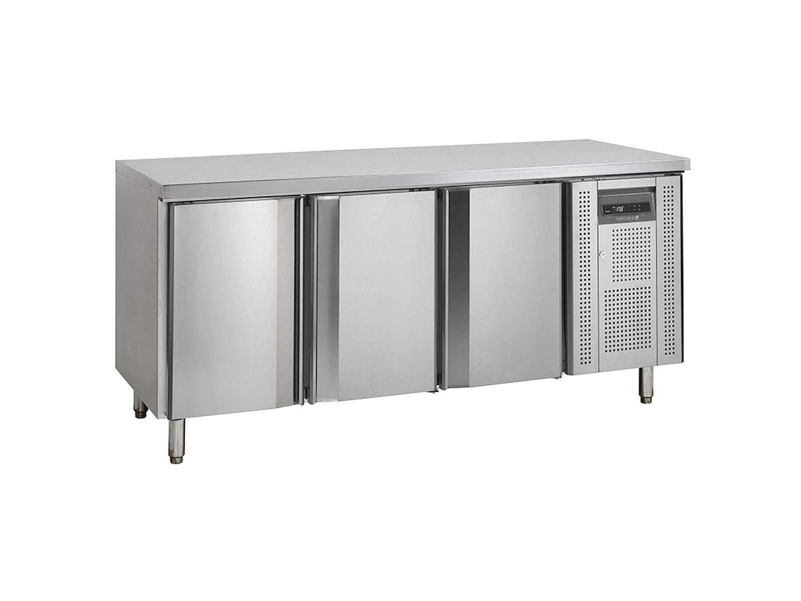 The stainless steel cabinet, both inside and out, makes this refrigerated display exceptionally durable and hygienic for daily use. The three self-closing doors minimize cold loss during busy periods, while the four adjustable legs make it easy to fit the display with the rest of the kitchen setup. The removable countertop with a rear edge provides both protection and flexibility in workflow.