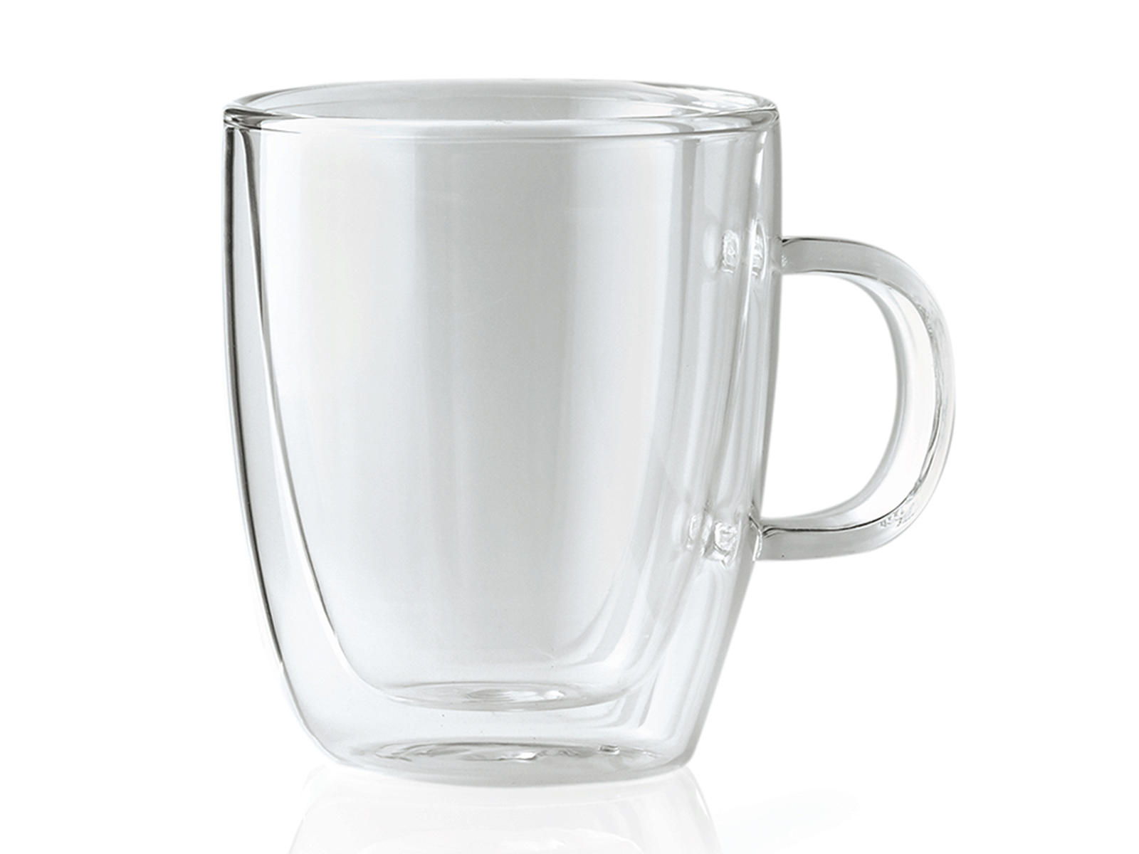 The double-walled design creates an insulating air layer between the two walls of the glass, providing multiple advantages in everyday use. Your hot drink retains its temperature significantly longer, while the outer surface remains comfortable to touch. This eliminates the need for extra coasters or napkins, as the glass does not condense with cold drinks or become too hot with hot drinks. The practical handle also provides a secure grip, even when the contents are very hot.