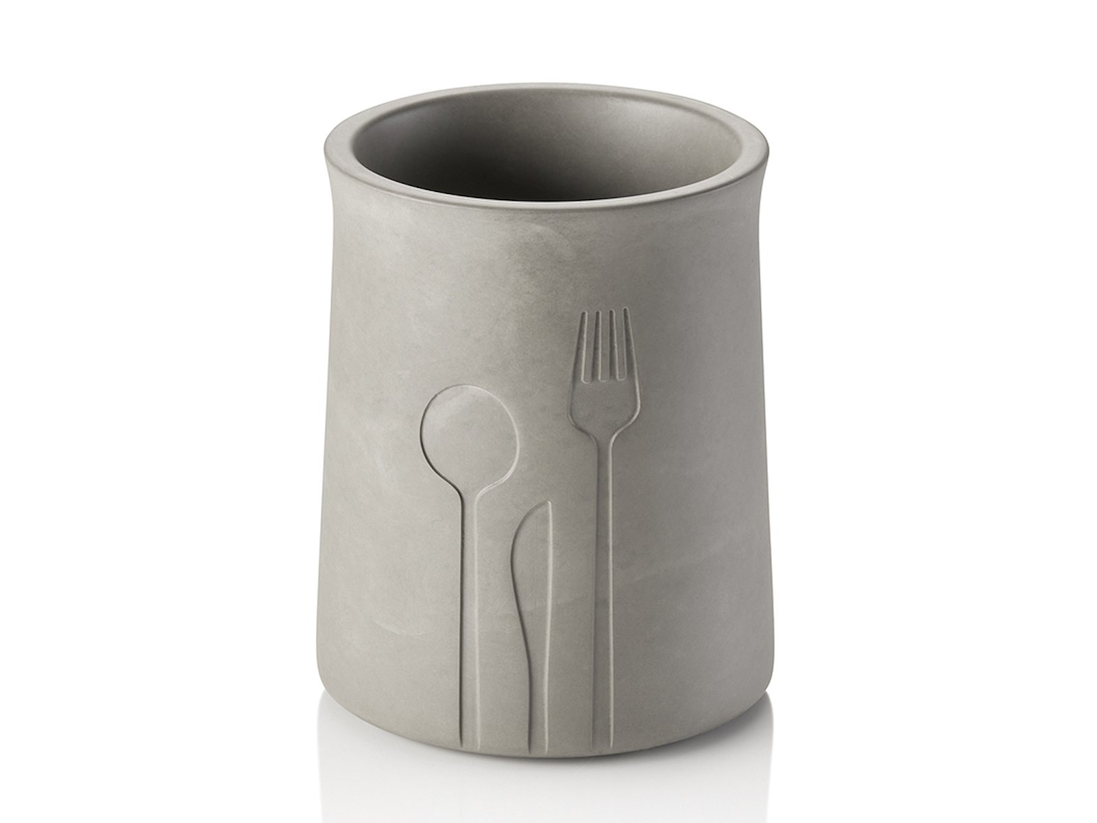 The cutlery holder from WAS has a diameter of 110 mm and a height of 145 mm. It weighs 1100 grams, providing perfect stability. The material is durable concrete in a neutral gray color, and the special underside is designed to be gentle on all types of countertops.
