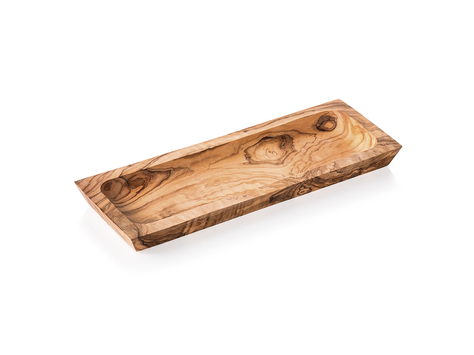 This handcrafted olive wood platter from WAS combines natural beauty with practical functionality. The elongated shape measuring 26x10x2 cm provides you with a versatile serving dish featuring the characteristic grain patterns of olive wood, making each platter unique. The platter is carefully oil-treated to enhance the wood's natural texture and provide optimal protection.