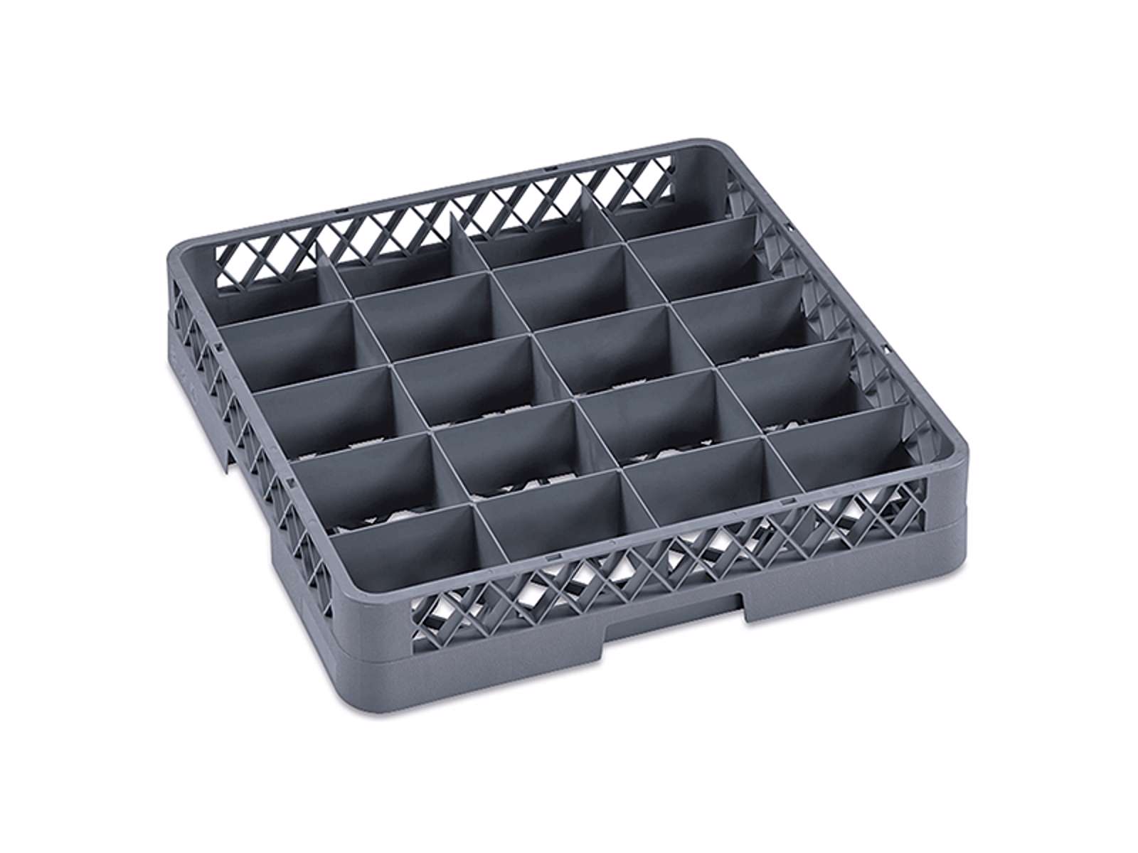 This gray dishwashing tray from WAS is specially designed to protect and organize your glasses and cups during machine washing. With standard dimensions of 50x50 cm and a height of 10 cm, it fits perfectly in most industrial dishwashers. The tray is made from durable polypropylene and features 20 separate compartments, each measuring 11.5x11.5 cm with a depth of 9.2 cm.