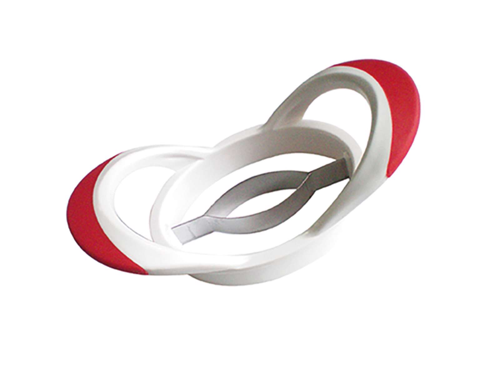 This red and white Westmark mango slicer is a specially designed kitchen tool that makes it easy to split mangoes up to Ø9 cm into two equal pieces. The sharp stainless steel blades remove the pit and slice the fruit in a single motion, while the ergonomic handles ensure a comfortable grip.
