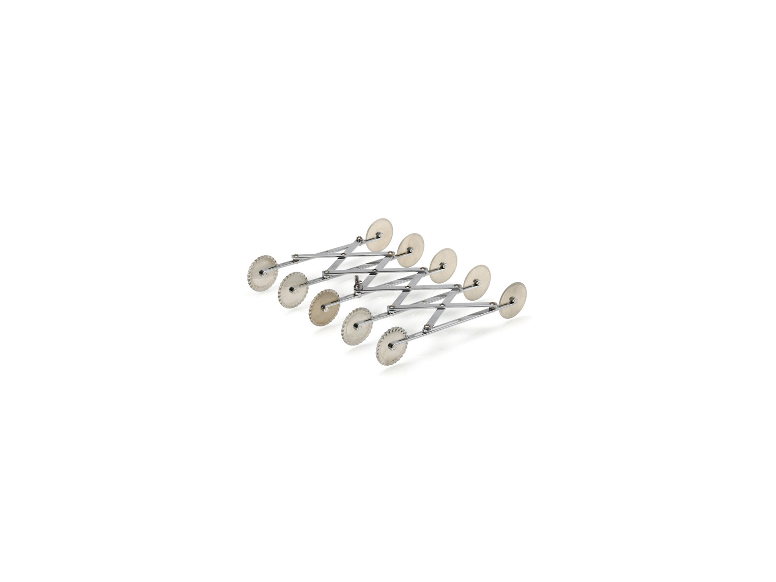 The dough cutter comes with a total of 10 wheels (5 smooth and 5 serrated), each with a diameter of 55 mm. The maximum adjustable distance between the wheels is 125 mm, allowing flexibility for various cutting widths. Made of stainless steel with a total weight of 725 grams, it combines durability with practical use in any kitchen.