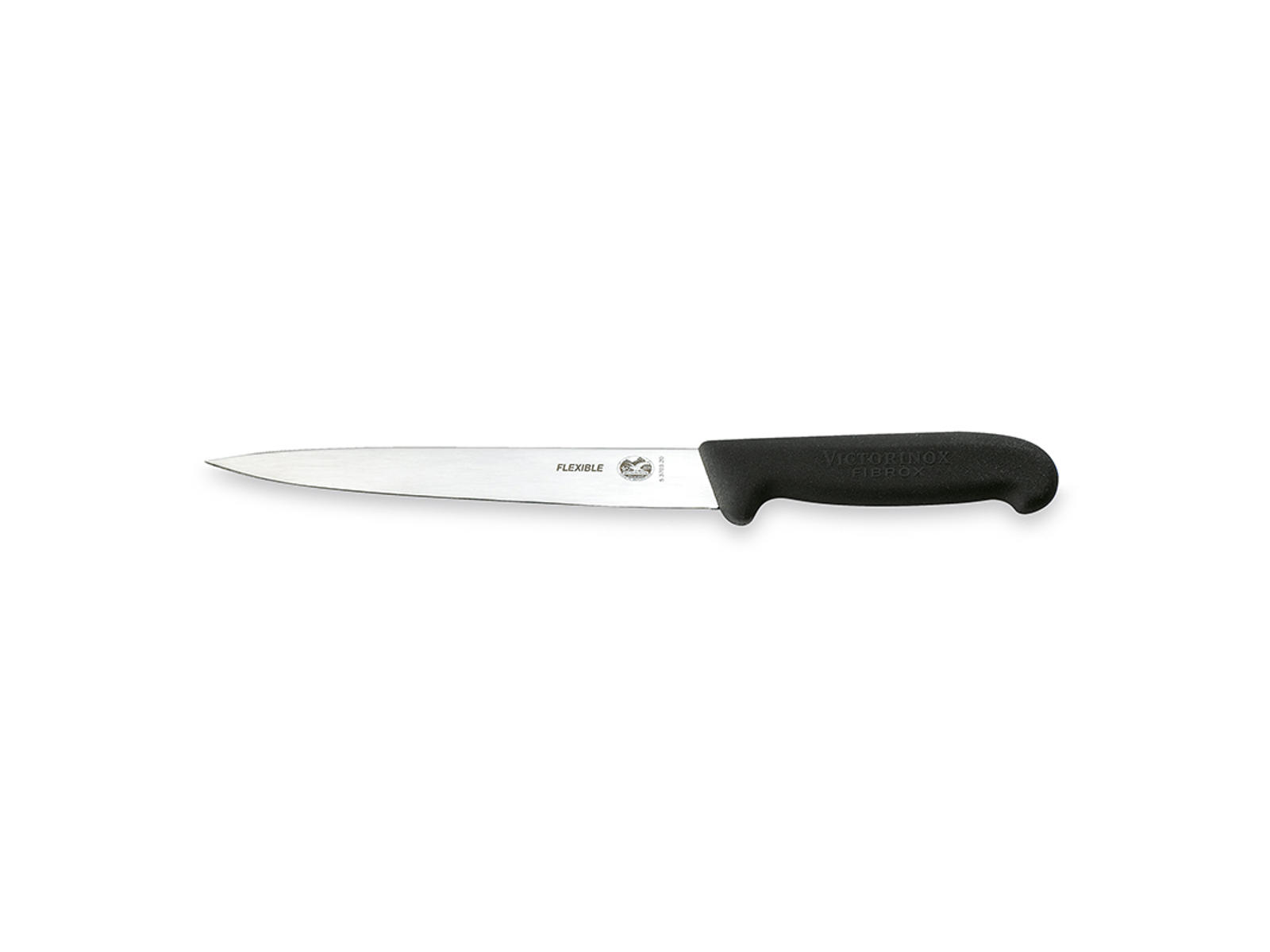 This Victorinox fillet knife features a 20 cm long, flexible stainless steel blade designed for precise filleting of fish and meat. The Fibrox handle ensures a stable grip even with greasy hands, while the slender, agile blade with a hardness of 55 HRC allows you to cut closely along the skin for minimal waste.