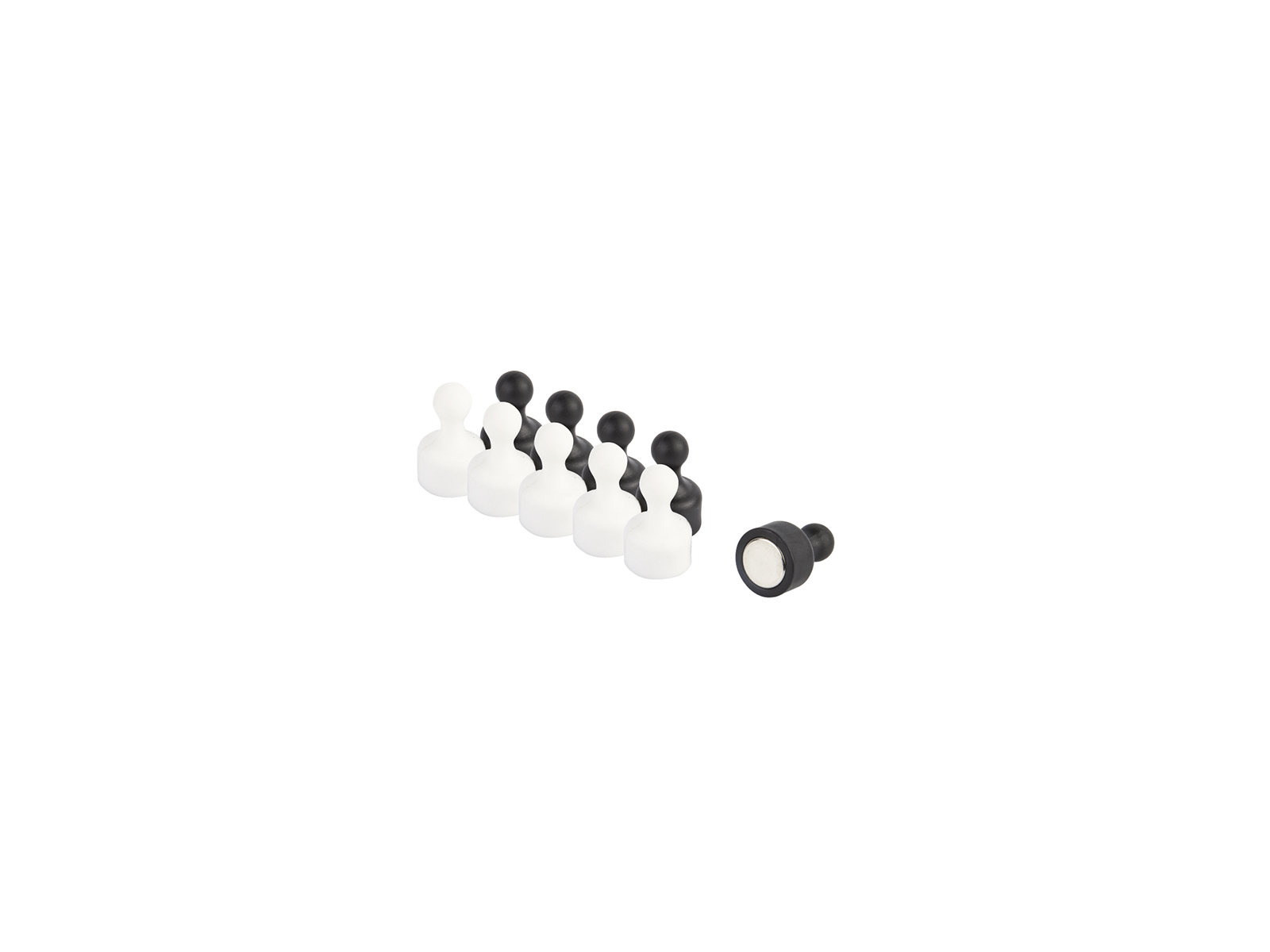 Each magnetic push pin measures 12 mm in diameter and 19 mm in height. The pack contains a total of 10 pieces - 5 black and 5 white. They are made with neodymium magnets, known for their exceptional magnetic strength. This makes them suitable for everyday use, where reliable fastening is crucial.