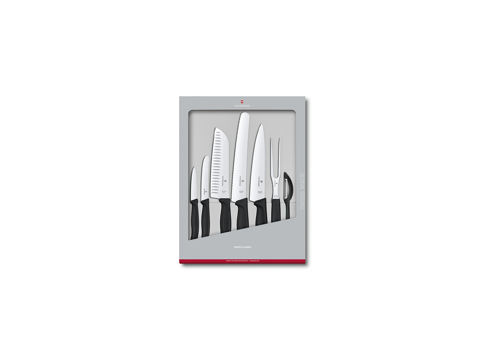 This Swiss Classic knife set from Victorinox includes 7 pieces made of stainless steel with black handles. The series is designed with a focus on functionality and durability, with each knife crafted with the Swiss precision that Victorinox is renowned for. The handles are made from Fibrox material, ensuring a secure grip—even when greasy during cooking.