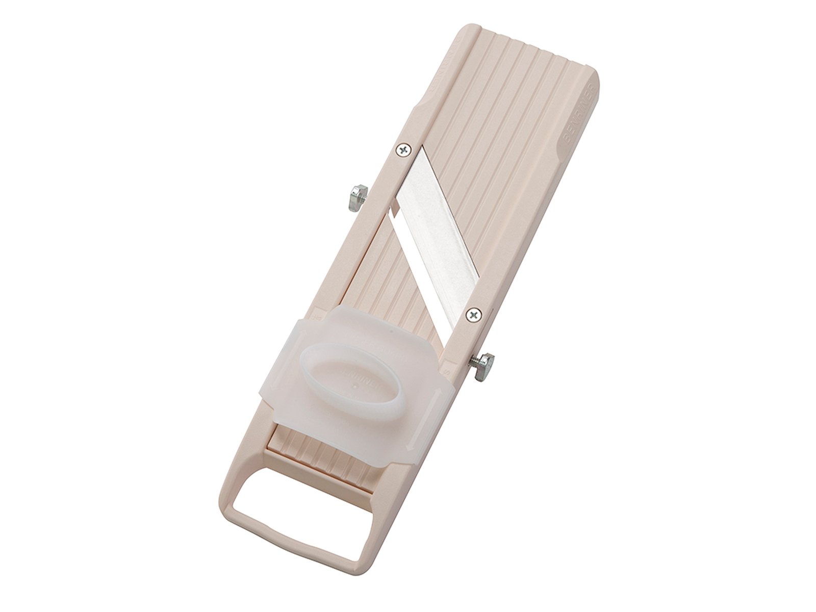 The mandolin measures 315 mm in length and 65 mm in width, with a height of 30 mm. It weighs only 290 grams, making it easy to handle. The ABS plastic is heat-resistant up to 70°C, ensuring durability with daily use. For your safety, the mandolin includes a safety mechanism that protects your fingers during use - an important feature when working with sharp blades.
