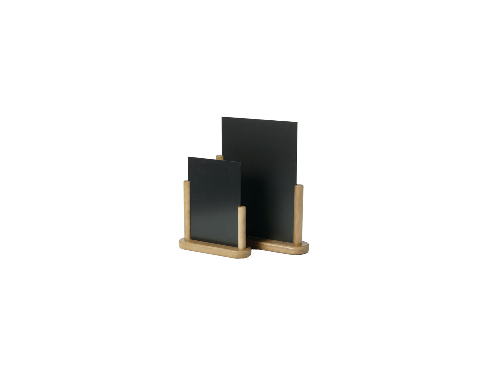 The double-sided feature allows you to display different information on each side, which is particularly useful at entrances or on tables where guests approach from different directions. The lacquered beech wood base gives the board a natural and warm appearance that fits into most interior styles. The combination of the dark board surface and the light wood creates a visual contrast that discreetly captures attention.