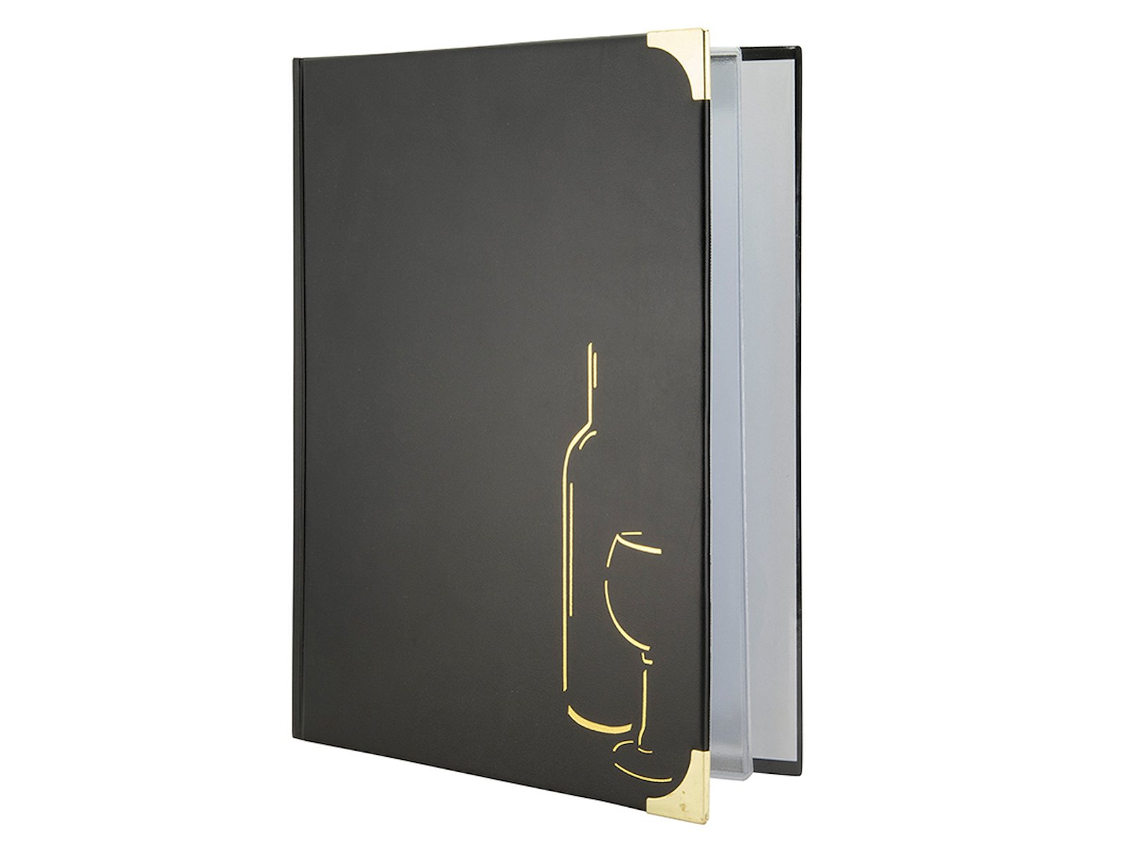 This Securit Basic wine list in black with a leather-like finish gives your wine menu a stylish and professional appearance. Featuring a golden motif of a wine bottle and glass, along with protective gold-colored metal corners, the wine list is both elegant and durable. The card comes complete with 4 fixed pockets for 8 A4 pages and 2 practical cover pockets.
