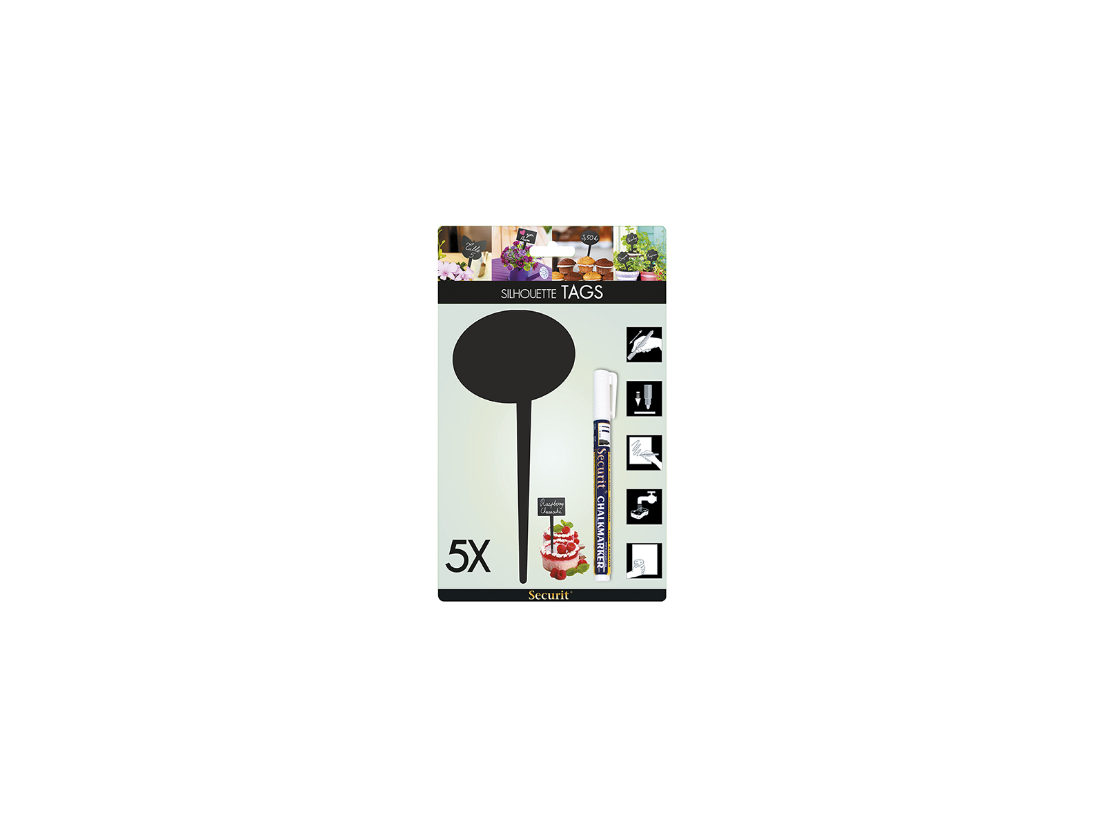 Each pack contains 5 speech bubble-shaped price tags made from black chalkboard material. The tags measure 18 cm in height, 8.1 cm in width, and have a thickness of just 1 cm. Weighing only 30 grams per tag, they are easy to handle and place. The material is made from durable plastic that withstands repeated use both indoors and outdoors. For best results in outdoor use, Securit waterproof chalk markers are recommended.
