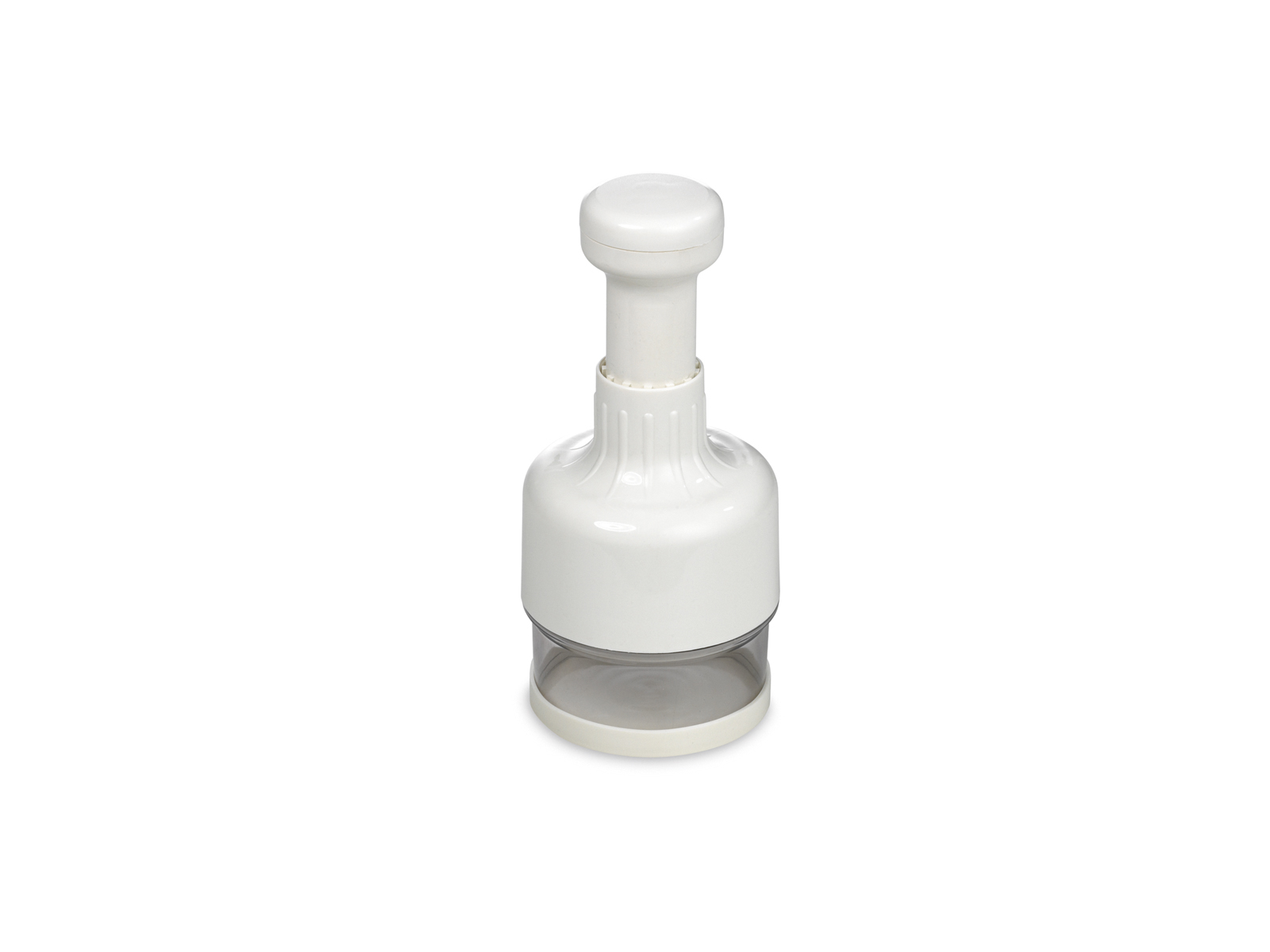 The onion chopper has a diameter of 91 mm and a height of 175 mm. It weighs 475 grams, providing good stability during use without being too heavy to handle. The combination of plastic and stainless steel ensures both durability and hygienic food handling.