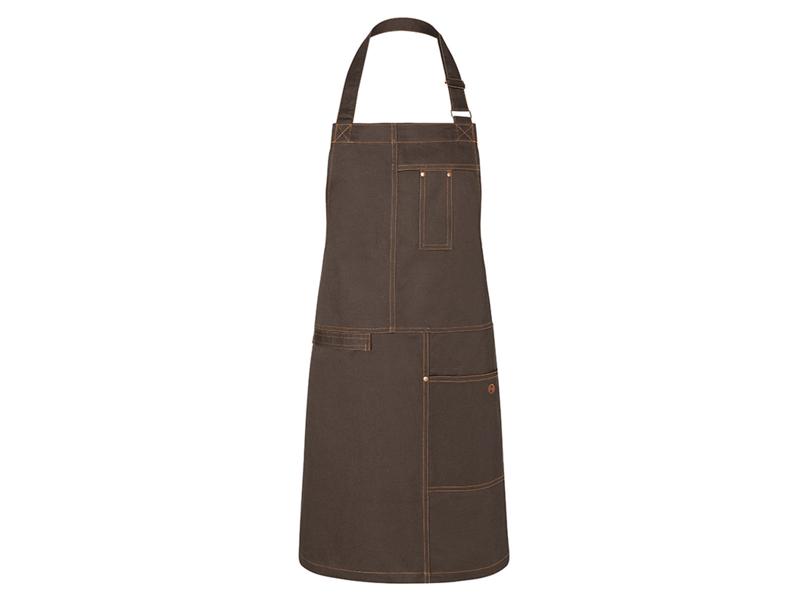 The apron features a spacious side pocket (19x21 cm) for easy access to your most-used tools. The integrated fabric loop is perfect for keeping a dishcloth within reach. The adjustable neck strap with buckle ensures the apron fits comfortably regardless of body type, which is especially valuable during long working hours. The bronze-colored rivets and contrast stitching add a modern touch to the classic design.