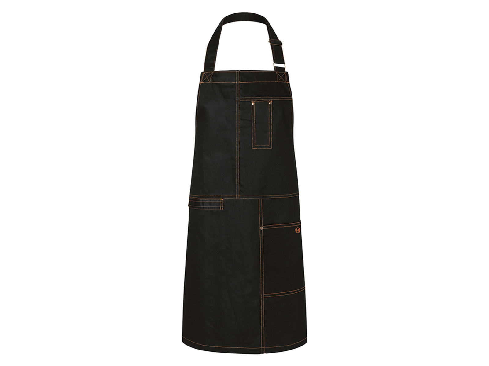The apron measures 68x80 cm, providing good coverage for most body types. The black color offers a timeless, professional look while being practical, as it conceals minor stains and wear. The contrasting stitching and bronze-colored rivets add a modern, urban touch that enhances the aesthetic appeal. Weighing 413 grams, the apron is substantial without feeling heavy during use.