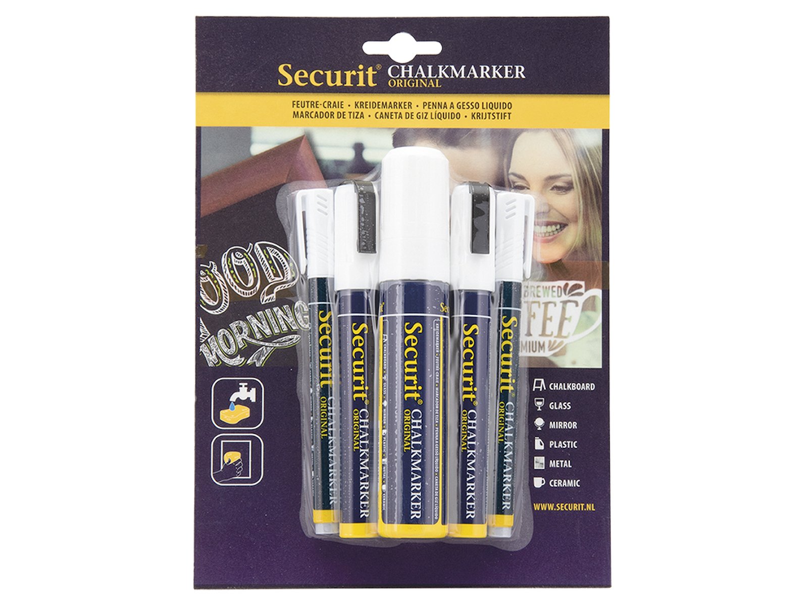 This set contains a total of five white markers distributed across three different tip sizes: two pieces with a 1-2 mm tip width for finer work, two pieces with a 2-6 mm tip width for mid-sized markings, and one piece with a 7-15 mm tip width for larger areas and headlines. All markers are packaged together, so you always have the right size at hand, regardless of the task at hand.