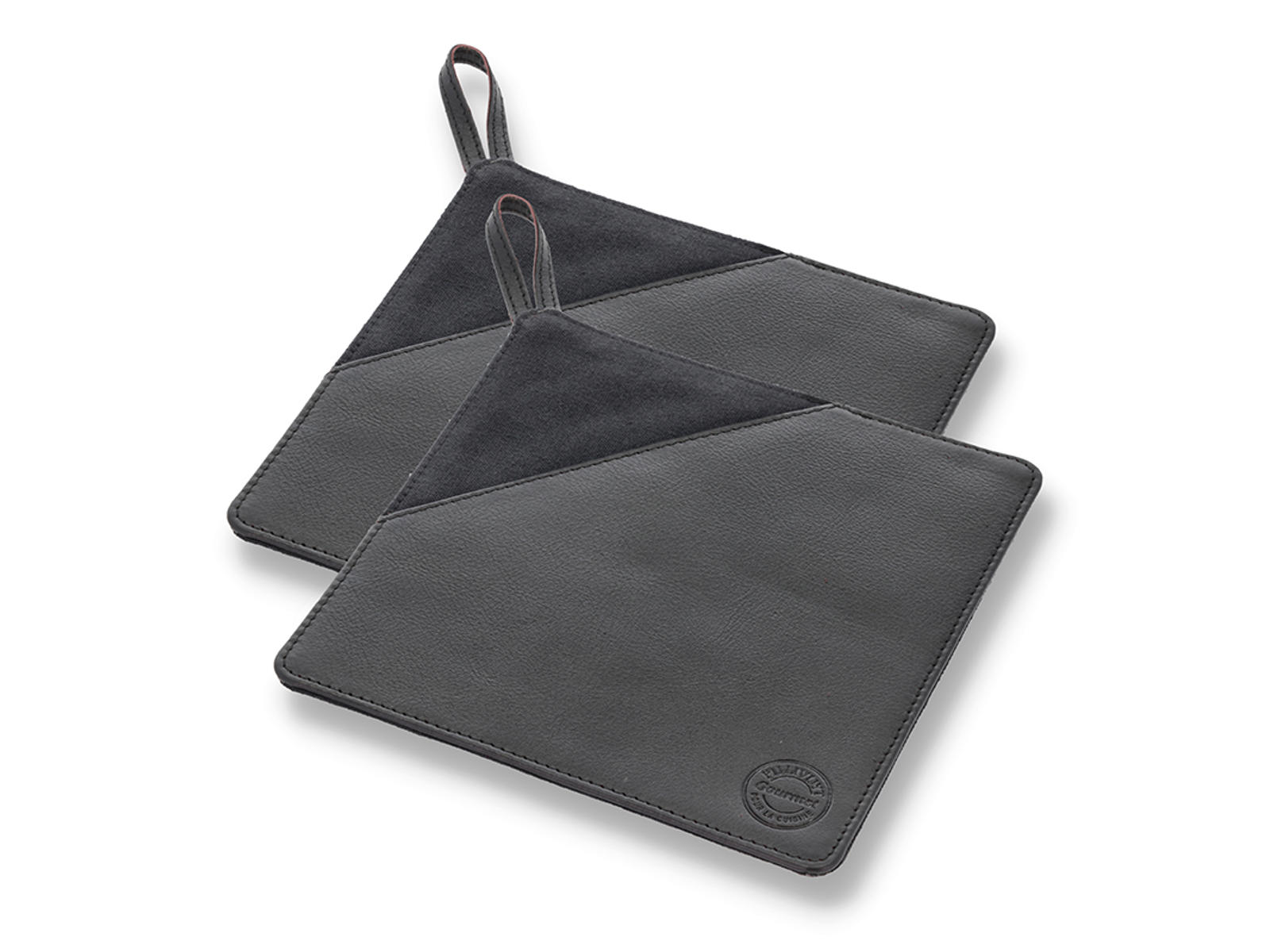 The pot holders come in a set of two, featuring a stylish black color with Pillivuyt branding. The canvas material consists of 100% cotton, while the leather part is made from 100% buffalo leather. With proper maintenance, the buffalo leather will last for many years, continuously developing its characteristic patina, making each pot holder unique over time.