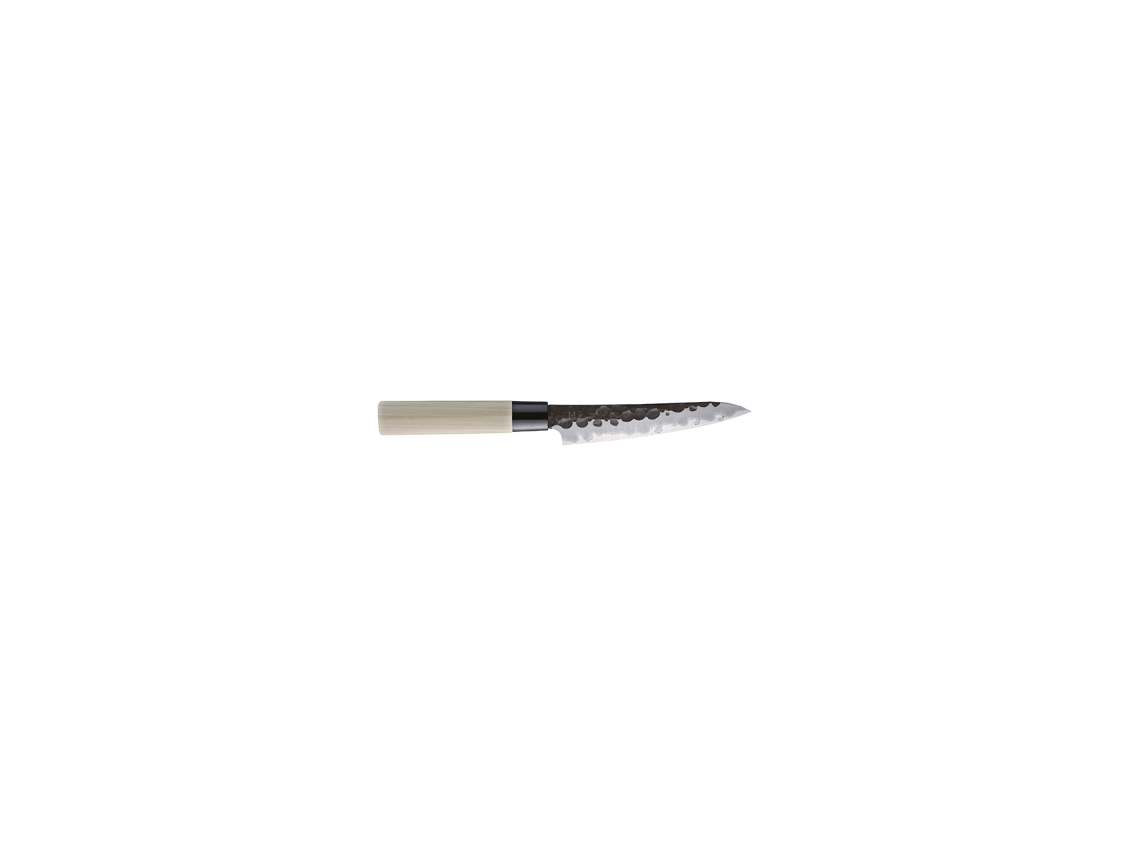 This 13 cm decorative knife from the Tojiro Hammered series blends traditional Japanese knife-making with modern materials. Crafted from VG10 steel with a distinctive hammered finish, this knife not only looks stunning but also minimizes the tendency of food to stick to the blade. With its lightweight wooden handle and razor-sharp edge, this knife is designed for precision tasks in the kitchen.