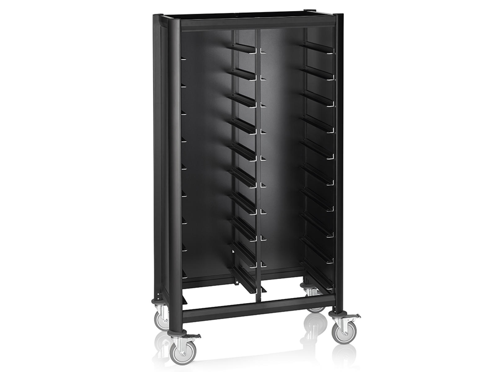The trolley is designed for trays measuring 45.5 x 35.5 cm, which is a standard size in many professional kitchens.