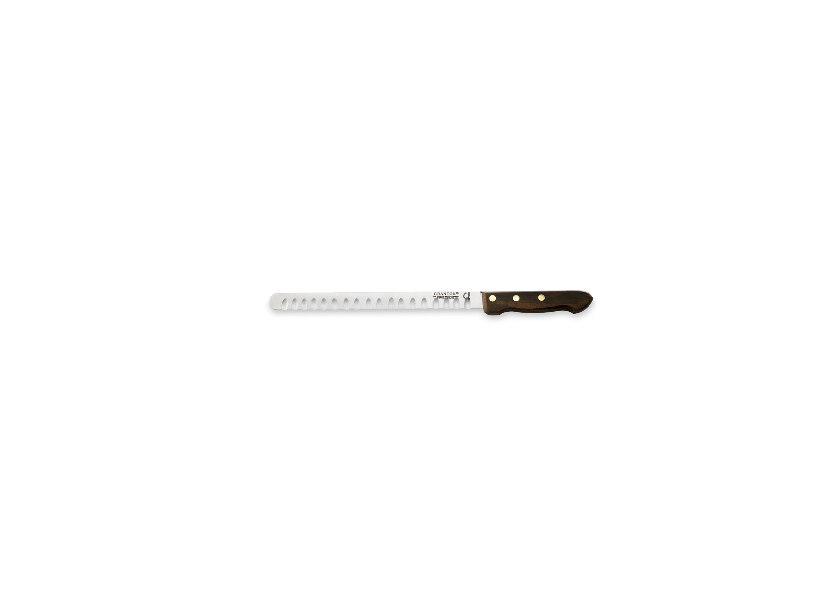 This 26 cm long Granton salmon knife is specially designed to cut salmon and other fish into thin, even slices. Thanks to the patented air pockets on both sides of the blade, the knife glides through the fish without tearing or crushing the flesh. The sturdy wooden handle provides a good grip, while the premium Sheffield steel ensures precise cutting every time.