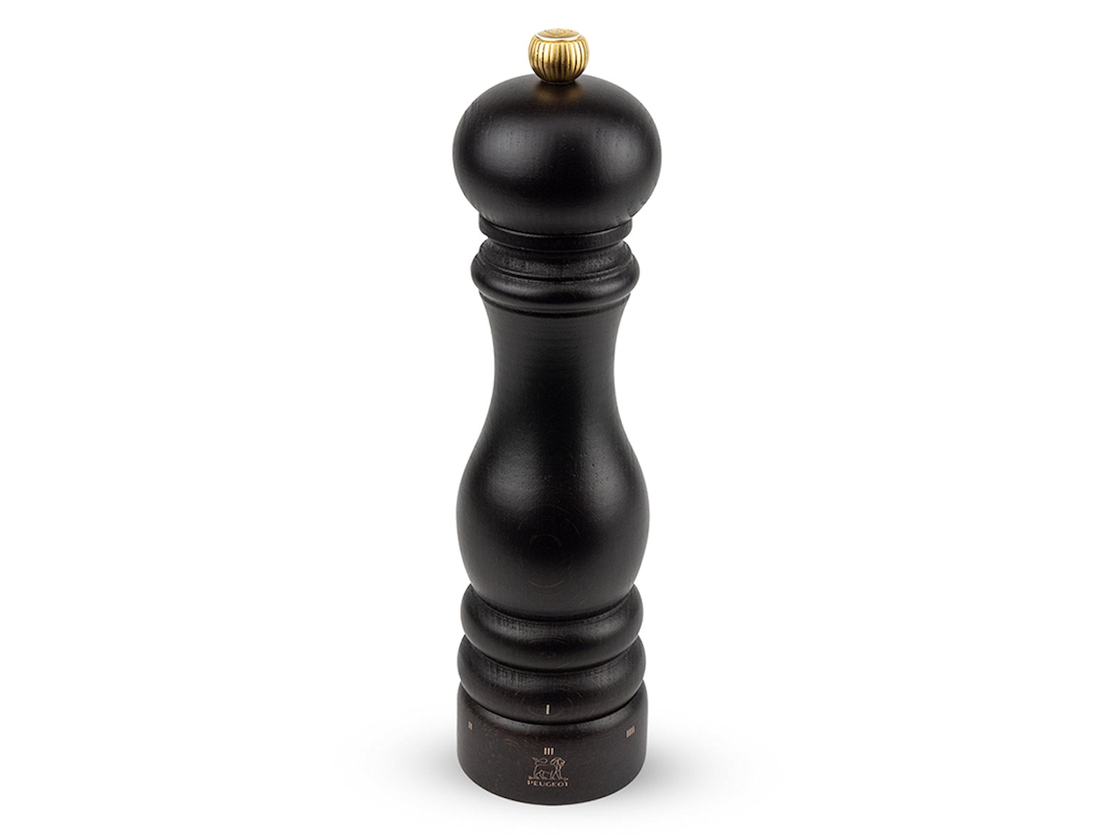 The salt mill measures 22 cm in height and weighs 370 grams. It is manufactured in France as part of Peugeot's classic Paris series, which has been produced since the 1800s. The grinding mechanism is made of Zirconia, a material harder than steel and resistant to moisture and salt. The surface is treated with a beautiful dark brown Chocolate finish that highlights the natural grain of the wood.