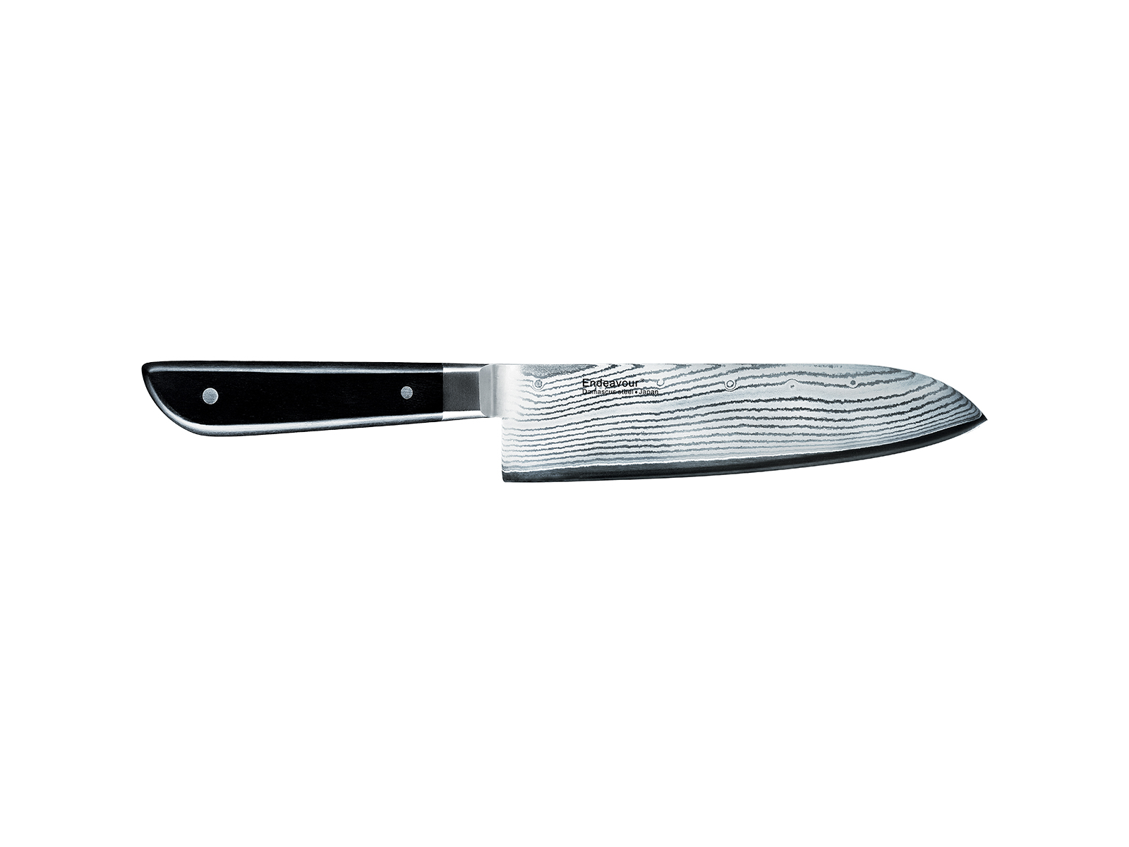 This Santoku chef's knife from the Endeavour Discovery Pro series is a high-quality cutting tool made from 67 layers of Damascus steel, featuring an ergonomic pakkawood handle. With a hardness rating of 60-61 HRC and a core of Japanese VG10 steel, this knife ensures exceptional sharpness and durability. Weighing 593 grams and with a blade length of 18 cm, it offers excellent balance and control.