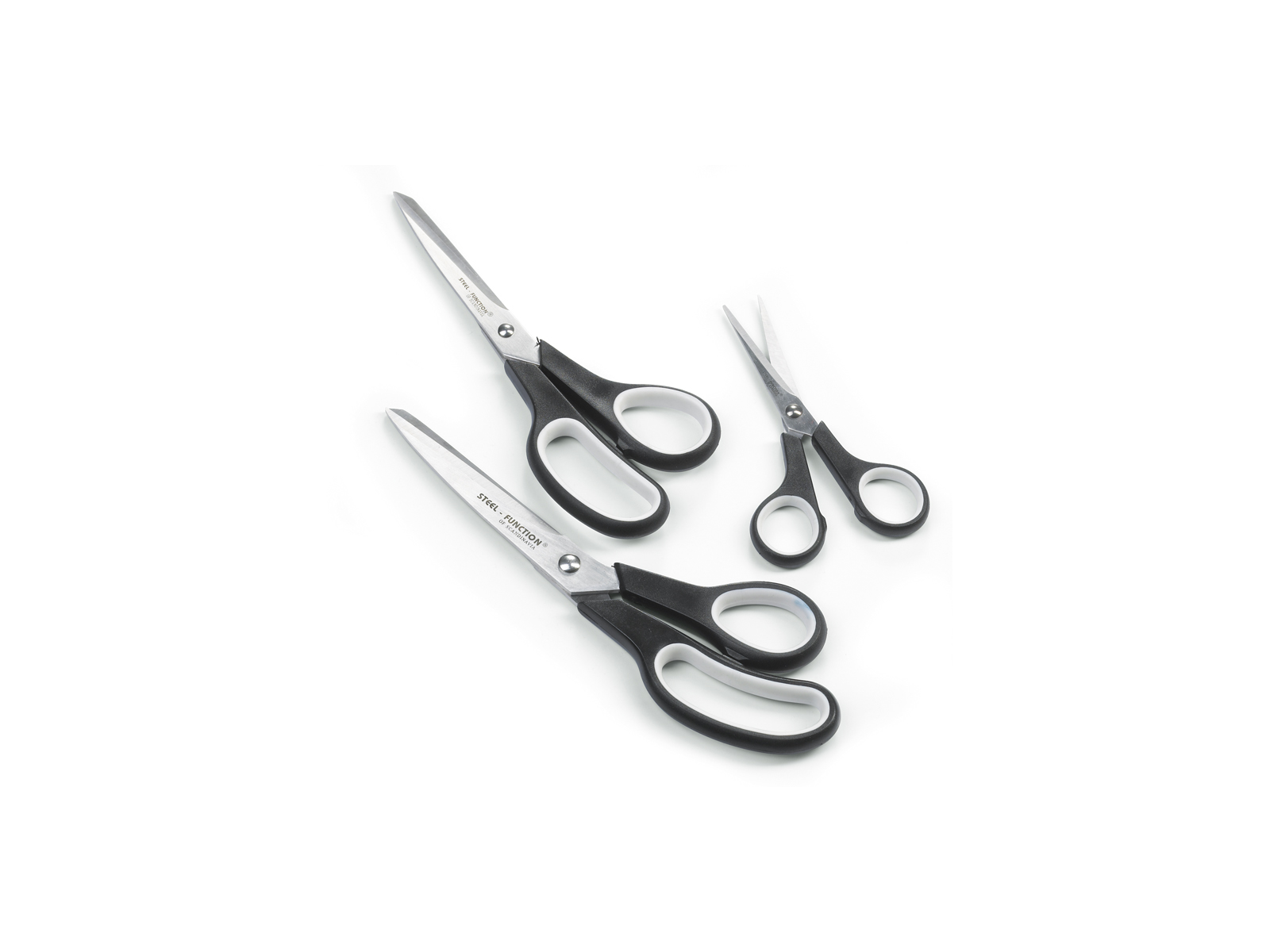 This versatile scissors set from Steel-Function includes three different stainless steel scissors that meet most household needs. Two larger scissors with black handles and white silicone edges ensure a comfortable, non-slip grip, while the third smaller pair is perfect for paper and lighter tasks. Weighing a total of 335 grams, the set is designed for right-handed users.