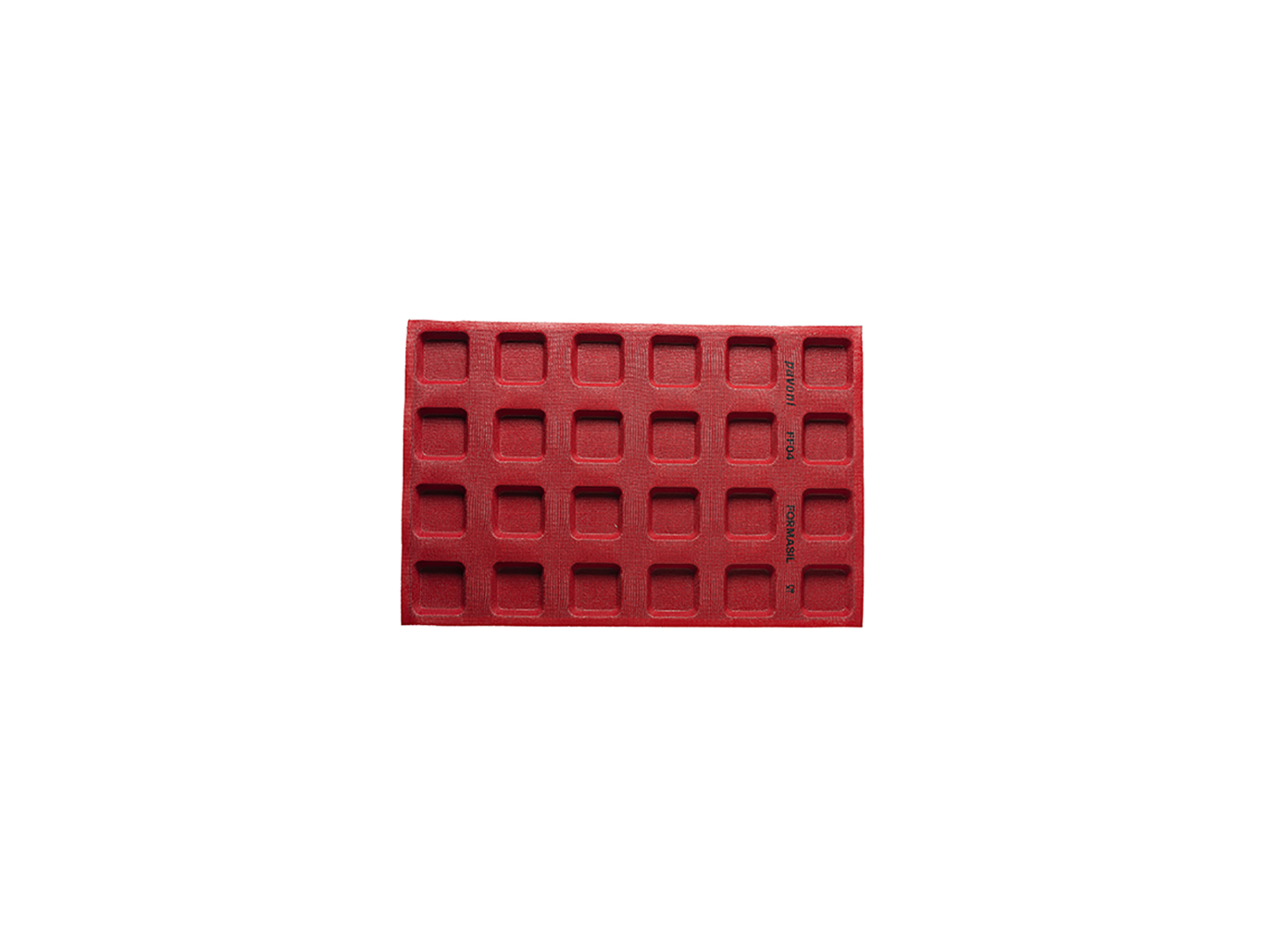 Pavoni's red Formasil baking mold made of flexible silicone allows you to create 24 uniform square treats every time. With an overall size of 400 x 600 mm and individual molds measuring 65 x 65 mm with a height of 20 mm, this versatile tool is perfect for both sweet and savory cooking.