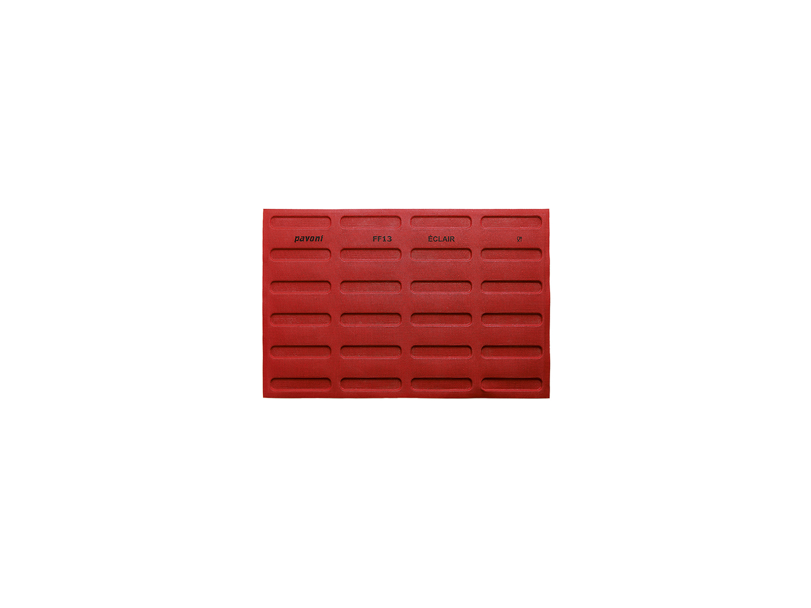 The Pavoni red Formasil baking mold allows you to create 24 uniform rectangular creations in one go. The mold measures 400 x 600 mm and is made from high-quality silicone, ensuring easy release. Each of the 24 molds has a volume of 71 ml and measures 150 x 30 mm.