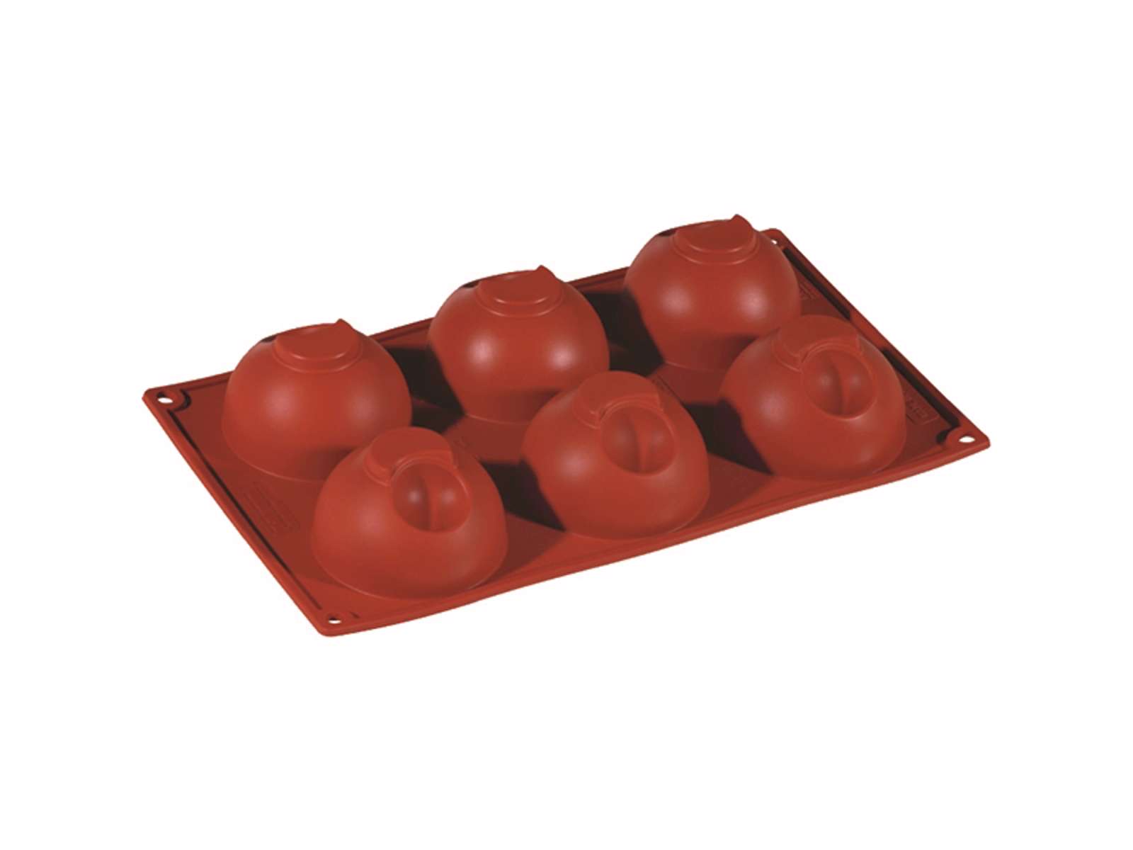 The mold is made from food-approved silicone in a vibrant red color, making it easy to identify in the kitchen. With precise measurements of 175x300x43 mm, it functions as a 1/3 GN tray. Each of the 6 cavities has a diameter of 75 mm and can hold 128 ml. The high temperature resistance from -40°C to +280°C provides maximum usability in all kitchen processes.
