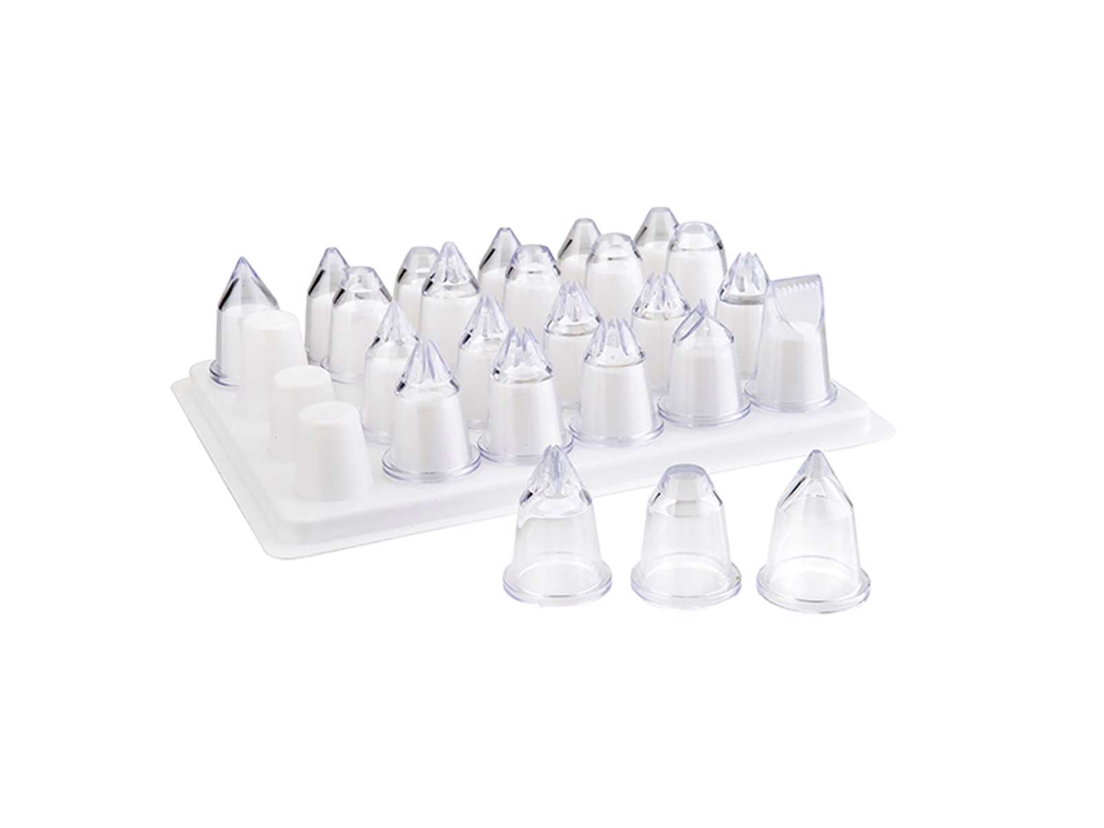 All 24 nozzles are designed to fit on the same acrylic base, making it quick and easy to switch between different nozzles while working. This clever design minimizes clutter in the kitchen and allows you to work efficiently, even when you need to use several different pattern types for the same project. The durable acrylic base ensures stability during use and protects the nozzles when not in use.