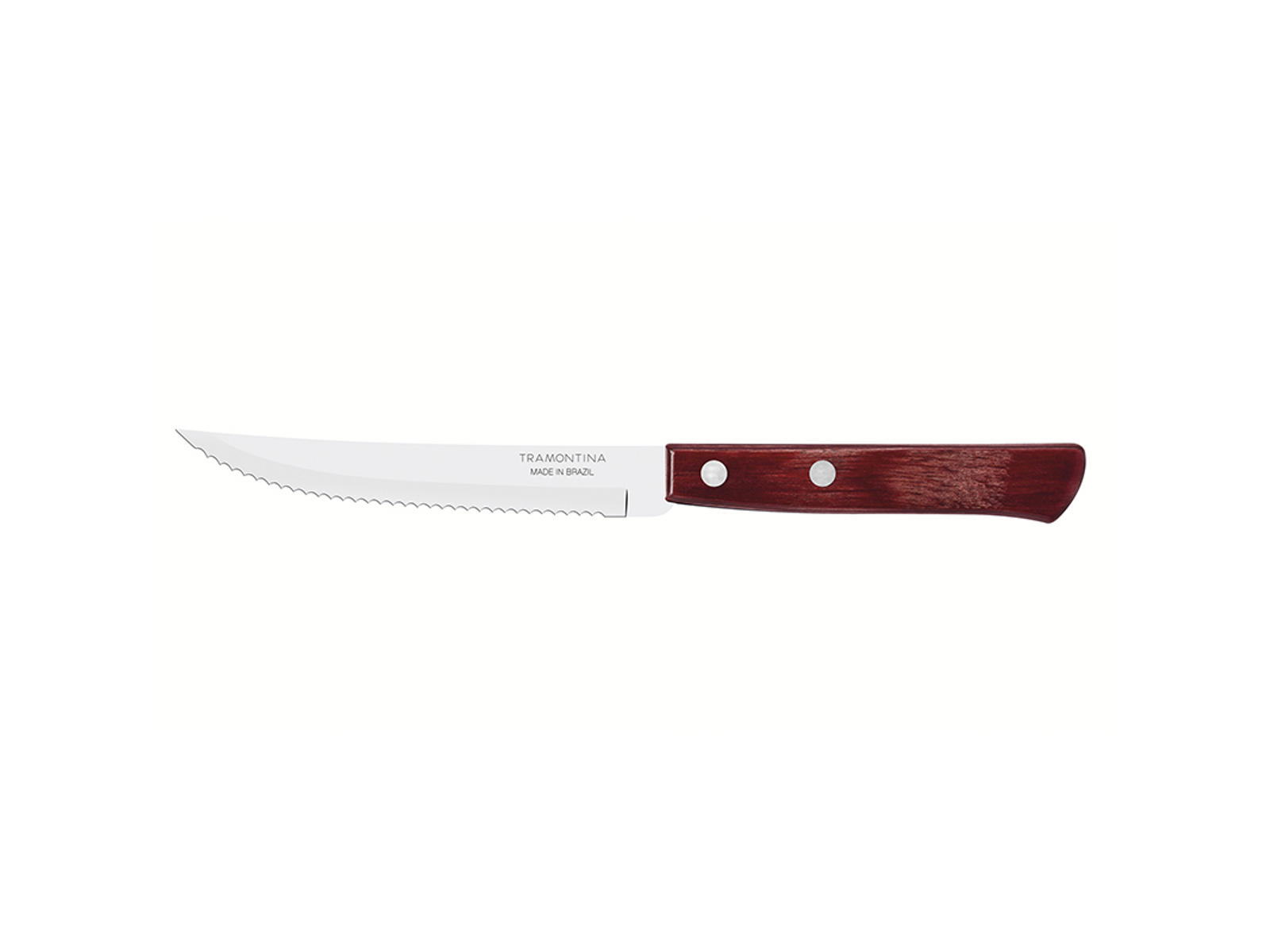 This Tramontina steak knife features a 12 cm blade made of AISI 420 stainless steel, combining sharpness and durability in a sleek design. The red Polywood handle provides a secure grip, while the effective serrated edge ensures precise cutting of meat without compromising its texture. Perfect for grill dinners and festive gatherings where both function and aesthetics play a vital role.