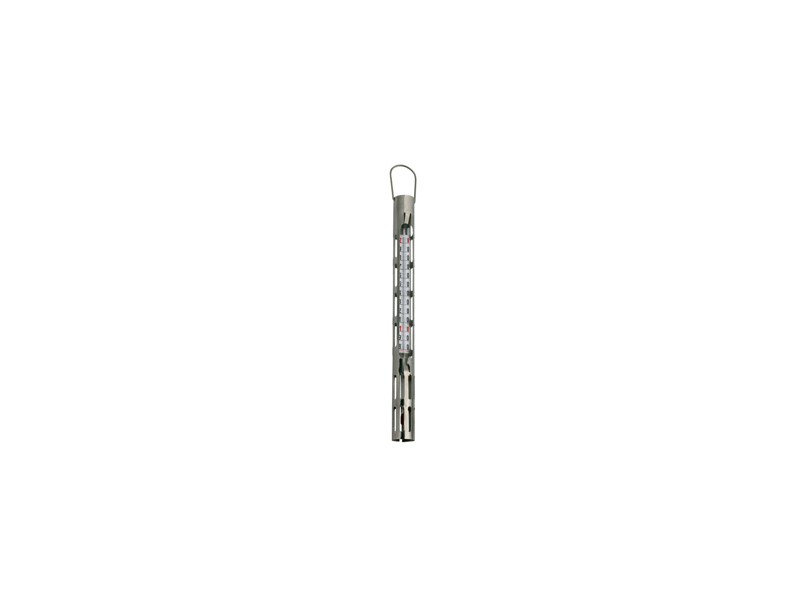 The Matfer Bourgeat Cooking Thermometer in stainless steel casing is a professional measuring instrument for the kitchen, featuring a temperature range from 80°C to 200°C. The thermometer has a clear glass body with red liquid inside a protective stainless steel casing, ensuring accurate temperature readings even during the most demanding cooking processes.