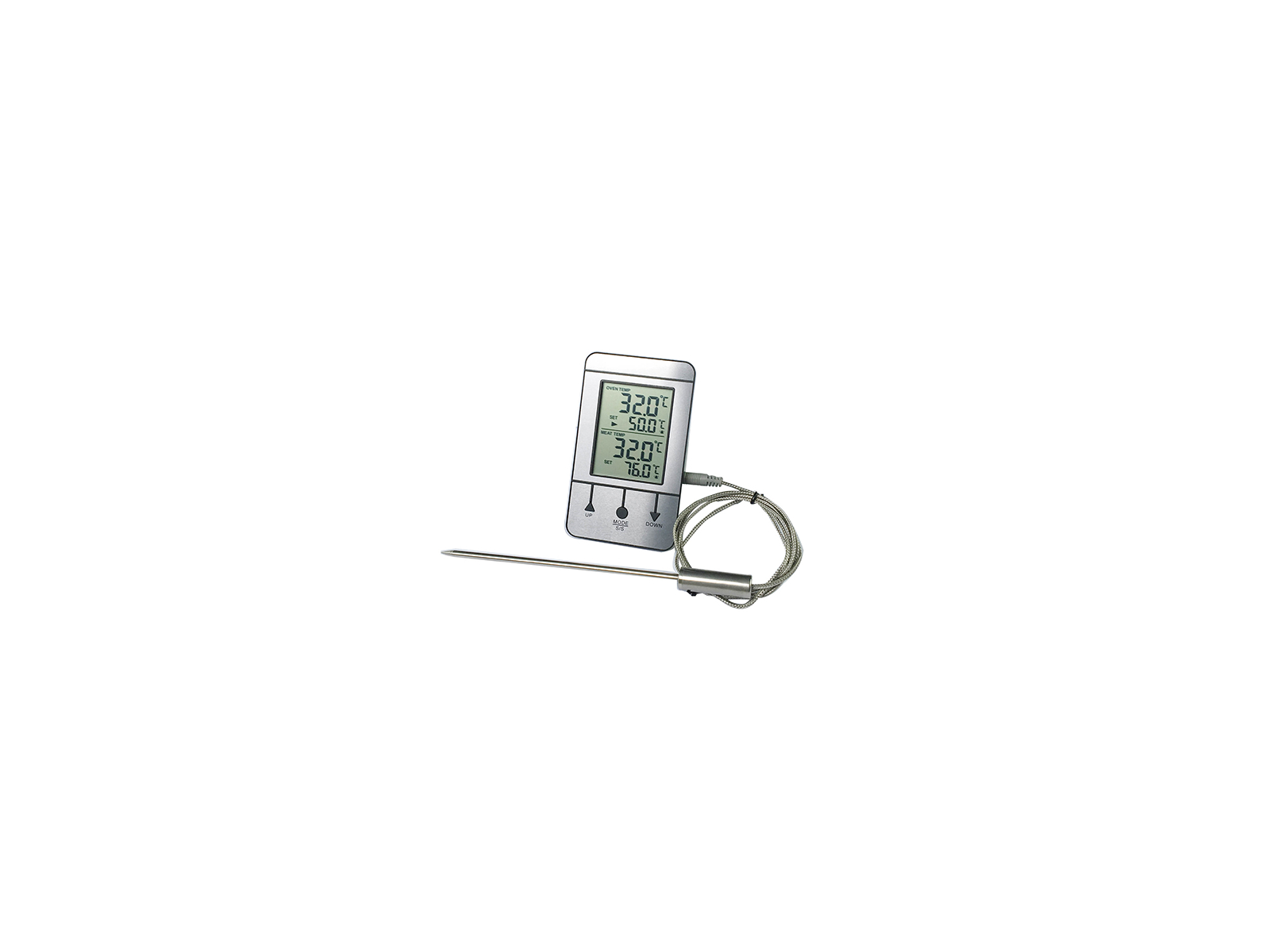 This digital meat thermometer from Thermometer Factory gives you precise control over your cooking with two separate measurement points. It measures both the core temperature of the food and the internal temperature of the oven or grill simultaneously, ensuring you always have a complete overview. Ideal for preparing meat, poultry, and other dishes where precise temperature control is crucial for a successful outcome.