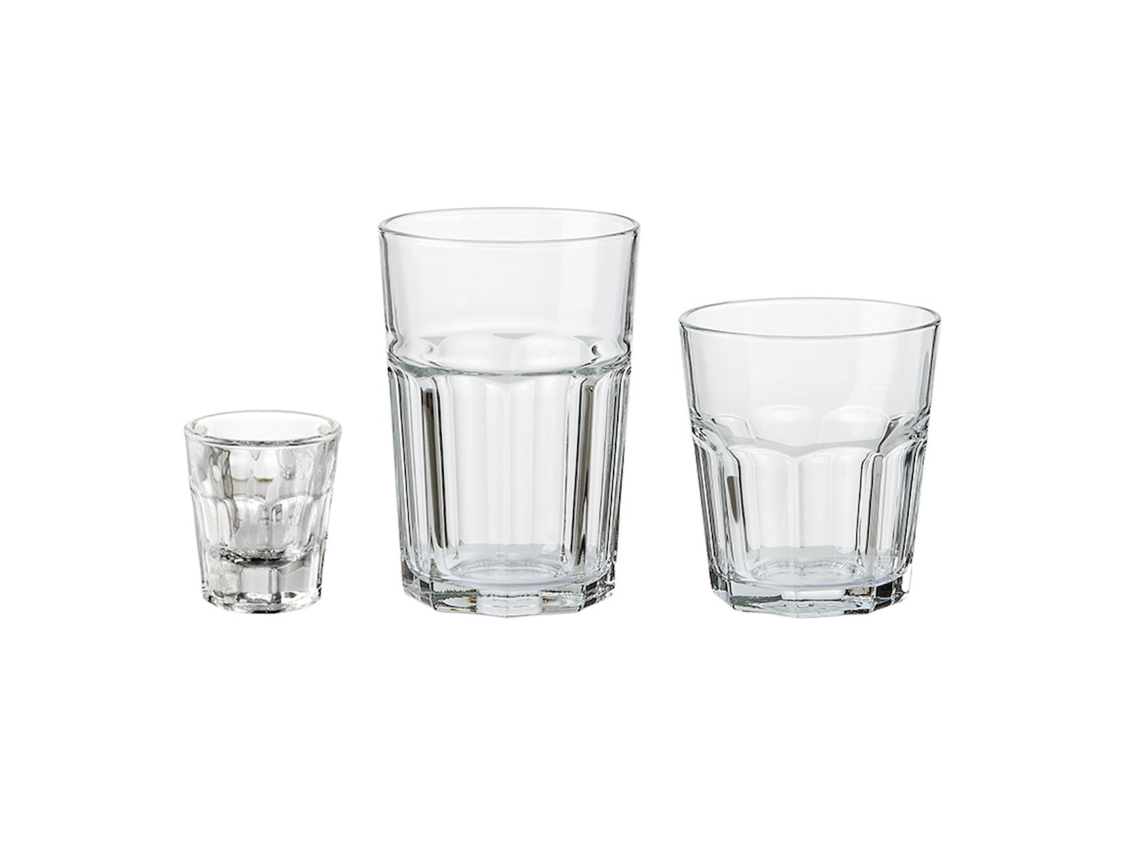 The tall glasses are ideal for café latte, juice, or cocktails, while the short glasses are perfect for water, whiskey, or smaller servings. The shot glasses complete the set, allowing you to serve digestifs or shots. The subtle pattern on the glass not only provides an elegant appearance but also ensures a good grip, making the glasses comfortable to hold. The thoughtfully varied sizes of the glasses ensure that you have just the right glass for every type of drink.