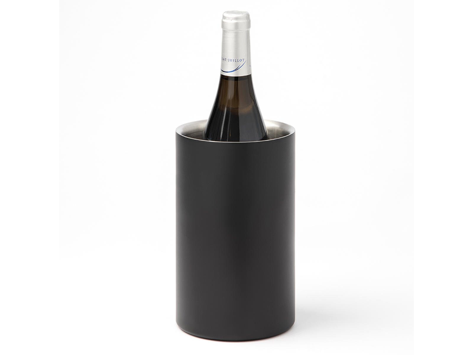 The wine cooler's double-layer construction in stainless steel offers several practical benefits. The insulating effect means your wine stays cold longer without the need for ice. This eliminates the problem of condensation dripping onto the table and prevents wine dilution if the bottle comes into contact with melting ice. Additionally, the matte black finish is resistant to fingerprints and scratches, ensuring a presentable appearance even after multiple servings.