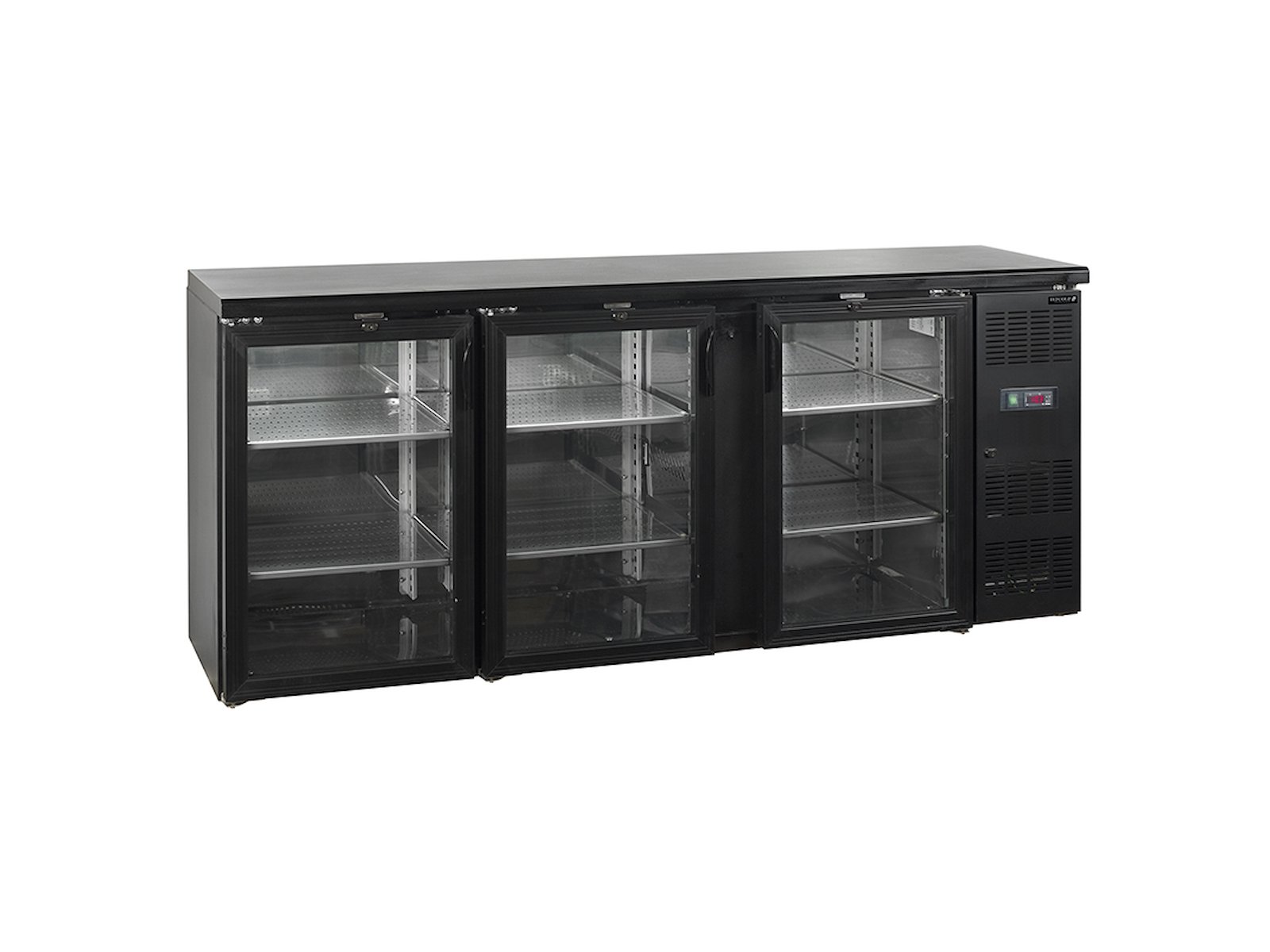 The Tefcold CBC310 is a spacious and reliable back bar featuring three self-closing doors and a capacity of 442 liters. It is equipped with a ventilated cooling system that ensures rapid and uniform cooling, along with a sturdy stainless steel construction with a black finish, making it both durable and hygienic.