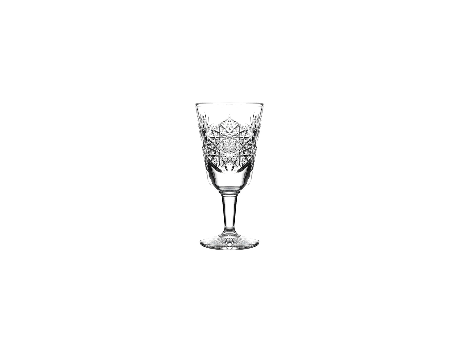 The Hobstar wine glass in a 30 cl size combines functionality with a striking design. This wine glass features a distinctive pattern with star-shaped cuts in the glass, creating a beautiful play of light when filled. The practical size of 30 cl makes it suitable for serving both red and white wine.